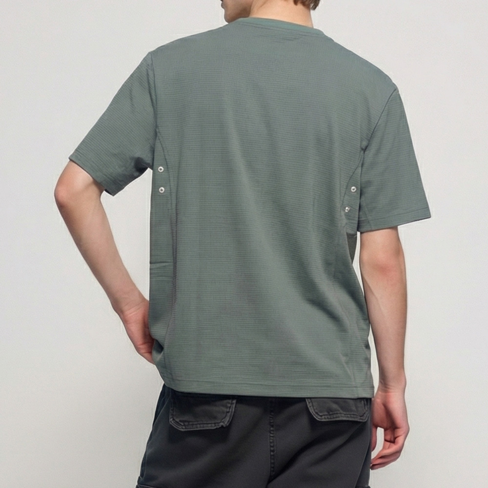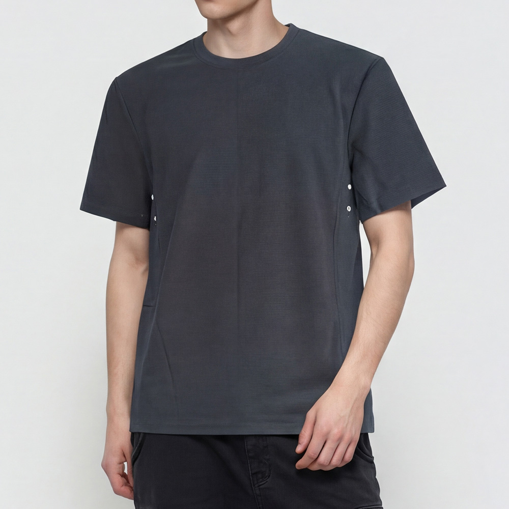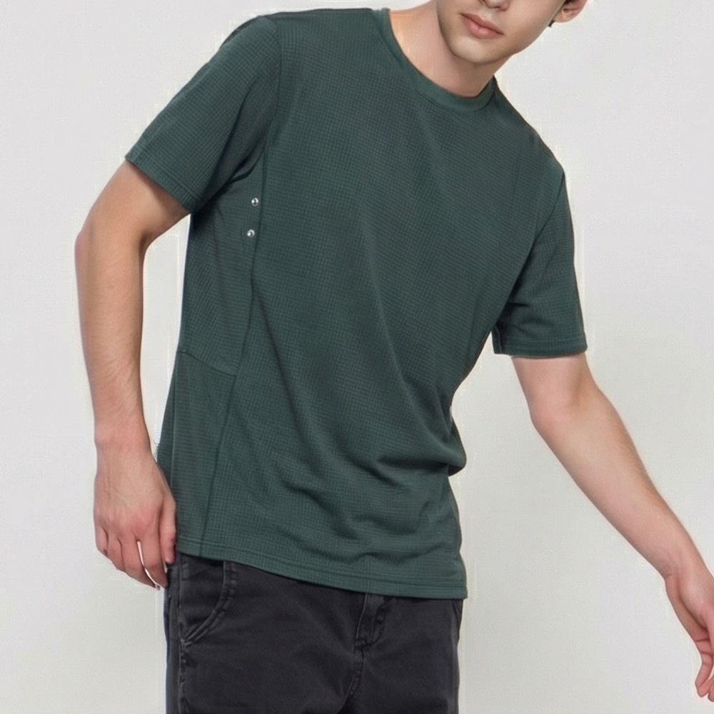 Crafted from a waffle-textured fabric, it features a delicate concave-convex grid surface that delivers both visual layers and a pleasant tactile experience.The slightly relaxed fit ensures maximum comfort, while the hidden side button design allows flexible adjustment of the hem slit—enhancing both wearability and stylish detailing.With a sleek, understated yet premium finish, it seamlessly complements diverse styling scenarios from daily casual looks to streetwear trends.