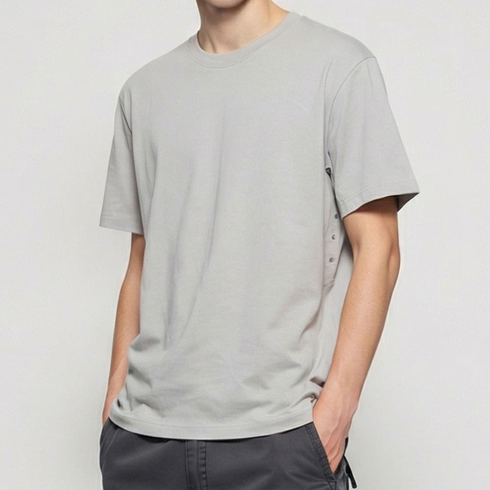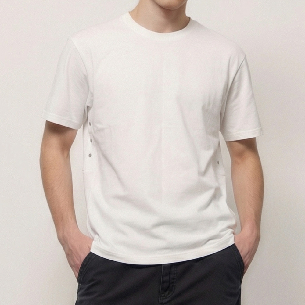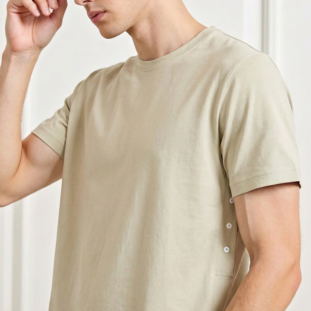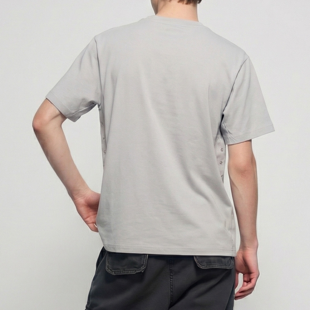 This is a basic crew neck short-sleeve T-shirt, crafted from a composite soft fabric that delivers an exceptionally soft and smooth touch with a subtle velvety finish.The tailored semi-relaxed fit strikes the perfect balance: it retains the sleek silhouette of a basic style while avoiding any tightness or restriction.The hidden side perforations are a standout detail, ensuring excellent breathability and comfort without stuffiness, and adding a stylish layered look to any outfit.With a minimalist and versatile design, it is an essential staple for everyday wear.