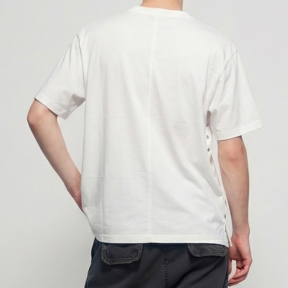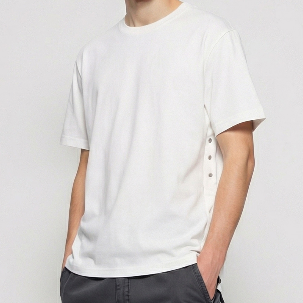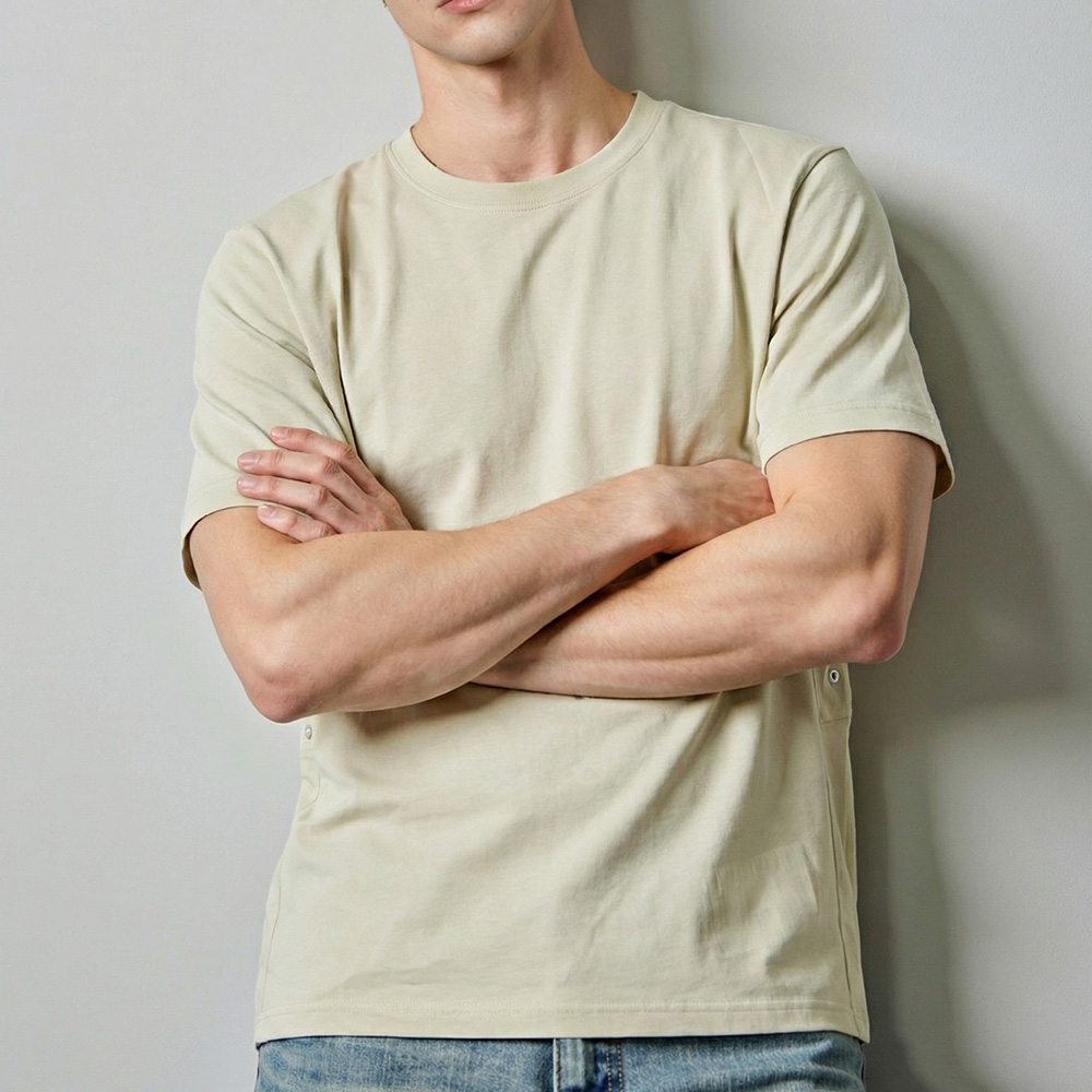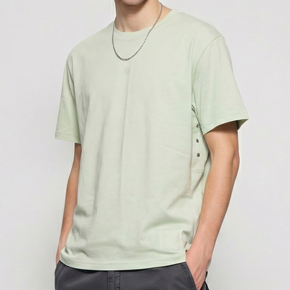 This is a basic crew neck short-sleeve T-shirt, crafted from a composite soft fabric that delivers an exceptionally soft and smooth touch with a subtle velvety finish.The tailored semi-relaxed fit strikes the perfect balance: it retains the sleek silhouette of a basic style while avoiding any tightness or restriction.The hidden side perforations are a standout detail, ensuring excellent breathability and comfort without stuffiness, and adding a stylish layered look to any outfit.With a minimalist and versatile design, it is an essential staple for everyday wear.