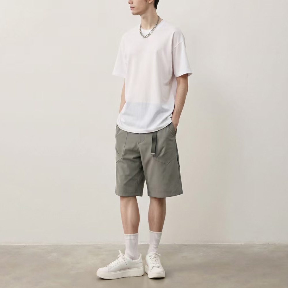 This light gray functional-style shorts are crafted from lightweight, quick-drying outdoor fabric and feature a sleek, minimalist cut, creating a look that blends functionality with urban sophistication. Equipped with an adjustable black buckle belt at the waist, they offer a precise fit for different waist sizes. Paired with slant pockets on both sides and three-dimensional patch pockets, they not only meet daily storage needs but also enhance the functional attributes through thoughtful detailing. The moderately loose length hits just mid-thigh, ensuring unrestricted movement while flattering the leg shape—making them an ideal choice for daily commutes and light outdoor activities.