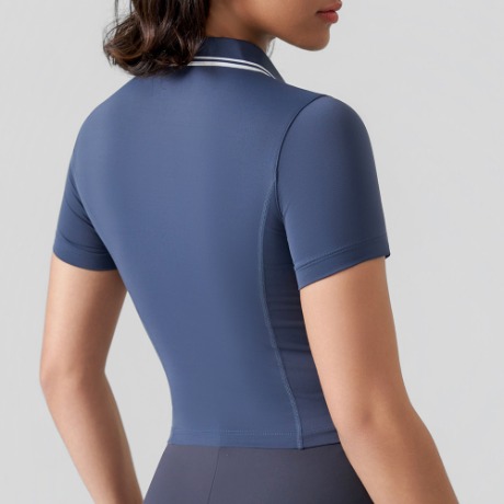 Its structured polo collar adds a polished touch, while the ribbed fabric delivers a snug, flexible fit that moves with you. Crafted from stretchy, breathable material, it works seamlessly for light workouts, errands, or casual outings.