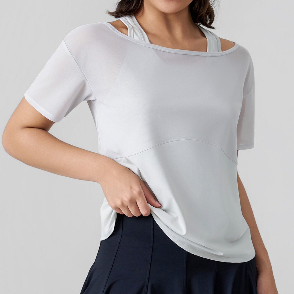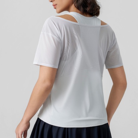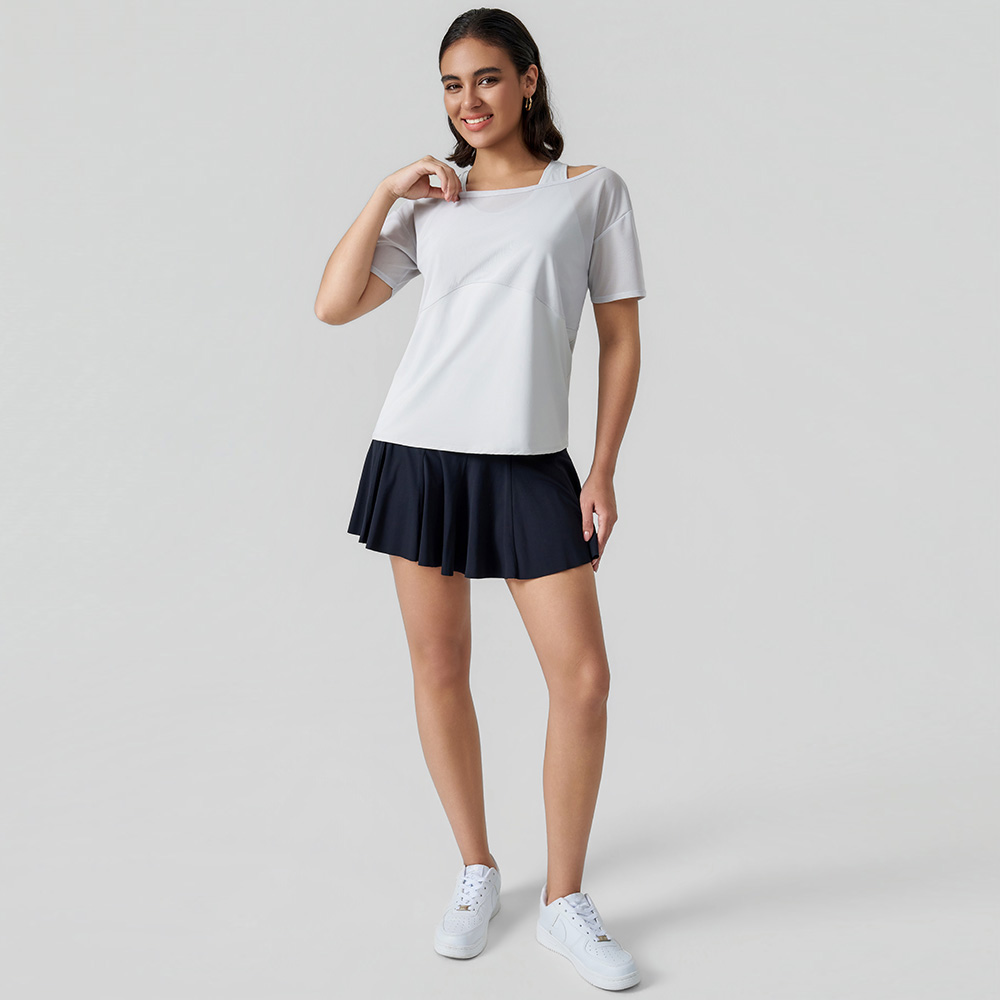 Its shoulder cutout adds a modern, playful touch, while the loose short-sleeve silhouette offers breathable flexibility for daily activities. Crafted from lightweight, flowy fabric, it works seamlessly for light workouts, errands, or casual outings.